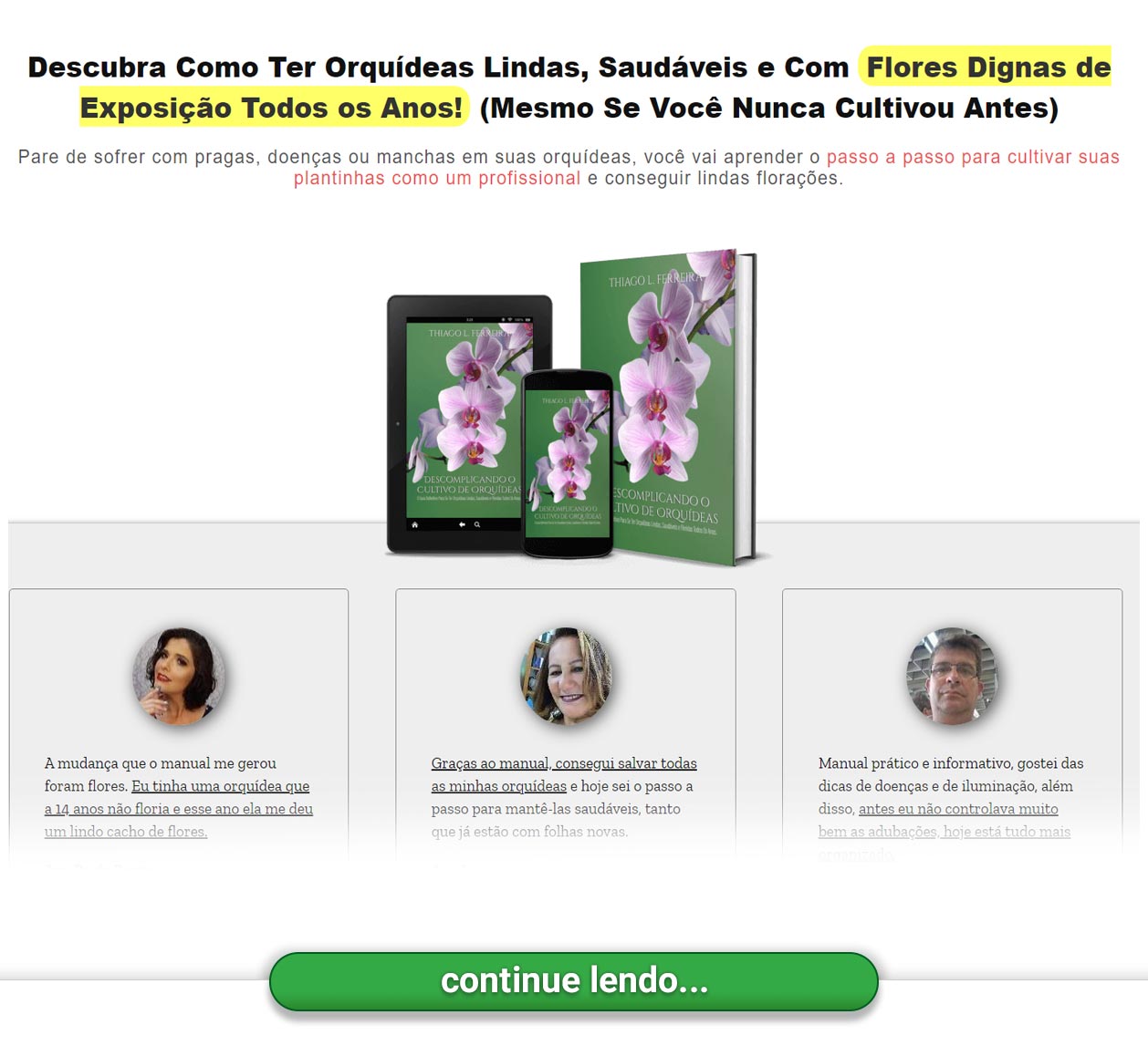 Conseguir fazer suas orquídeas florirem é um dos maiores desafios dos cultivadores iniciantes de orquídeas. Muitos não sabem que essas plantas necessitam de cuidados especiais e, por isso, ficam perdidos na hora de cultivá-las. Neste manual, o aluno vai aprender o passo a passo para conseguir orquídeas lindas, saudáveis e floridas todos os anos, mesmo sem ter nenhum conhecimento prévio. Ele não vai ter que gastar anos estudando ou perdendo orquídeas em seus testes. Todo o conhecimento necessário está nesse manual. Este ebook já está na versão 3.0, fomos atualizando com base no Feedback de nossos clientes. Hoje o comprador recebe o Manual + 6 bônus que vão ajudá-lo a levar o seu cultivo a um novo nível. Este é um produto feito em uma linguagem simples, onde o orquidófilo vai aprender tudo para se ter as orquídeas lindas.